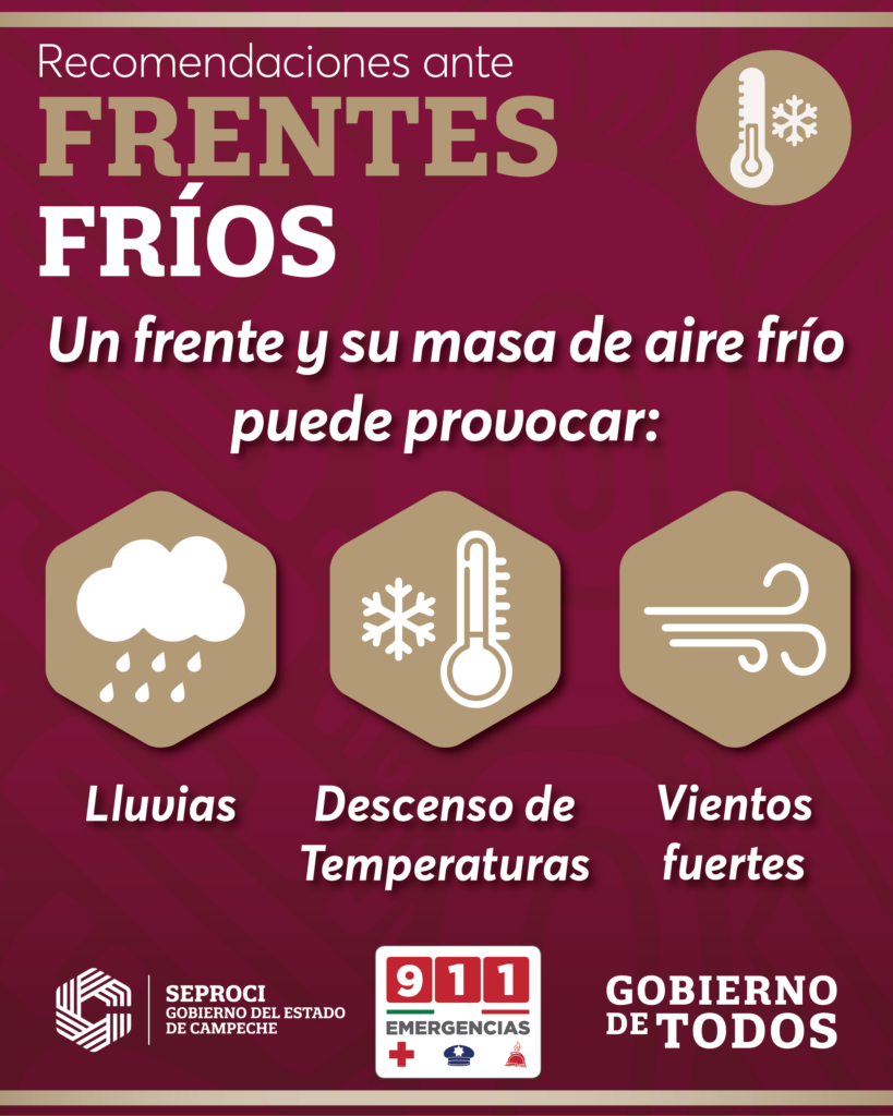 La Secretaría de Protección Civil del Gobierno del Estado de Campeche informa a la población que se prevén efectos asociados al Frente Frío No. 28, los cuales podrían generar condiciones de tiempo inestable en el Estado de Campeche a partir de este jueves.